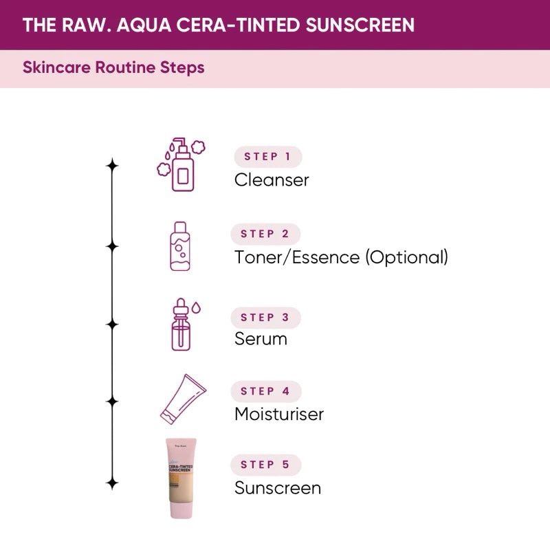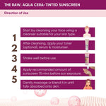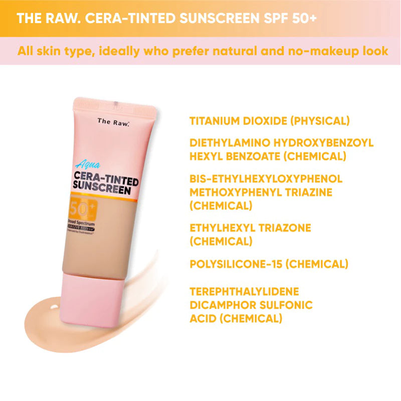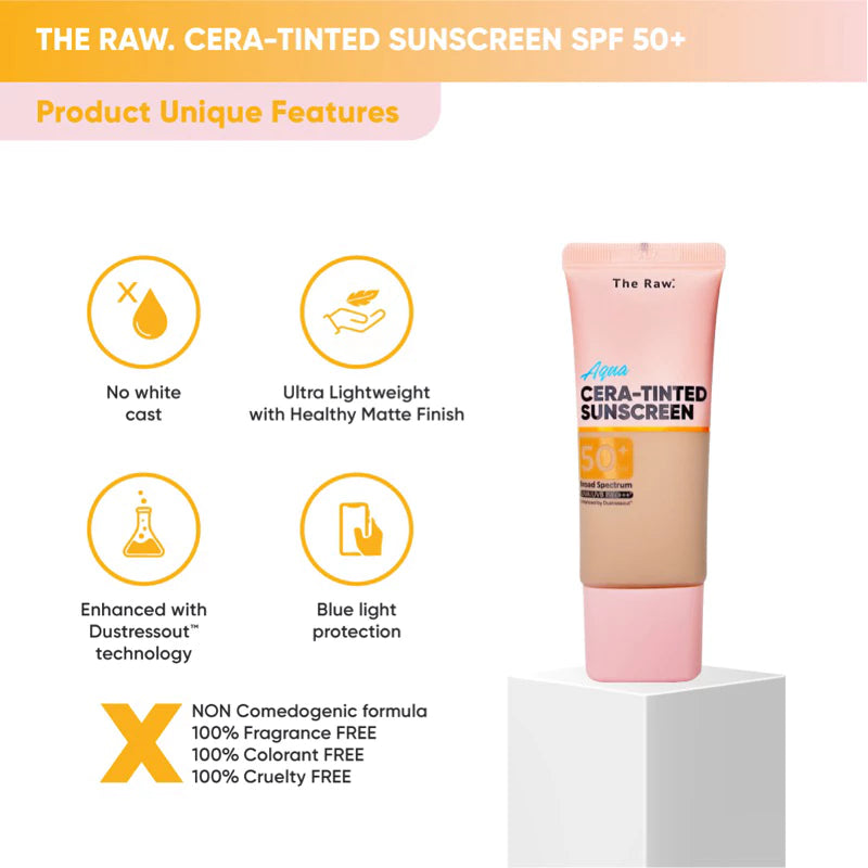 The Raw. Aqua Cera-Tinted Sunscreen is a lightweight tinted sunscreen that combines skincare benefits with high sun protection. Formulated with seven ceramides, cholesterol, and fatty acids, it helps strengthen the skin barrier while protecting against UV rays and blue light with SPF 50+ PA++++. The smooth texture leaves no white cast, offering light coverage with a healthy matte finish that evens out the skin tone for a natural look. Enriched with five anti-pollution ingredients, it provides long-lasting, shine-free comfort and protection from environmental stressors, keeping the skin radiant and balanced throughout the day.